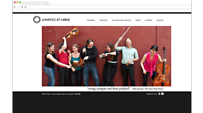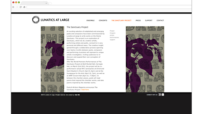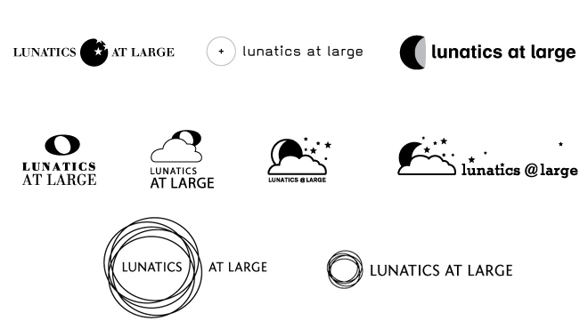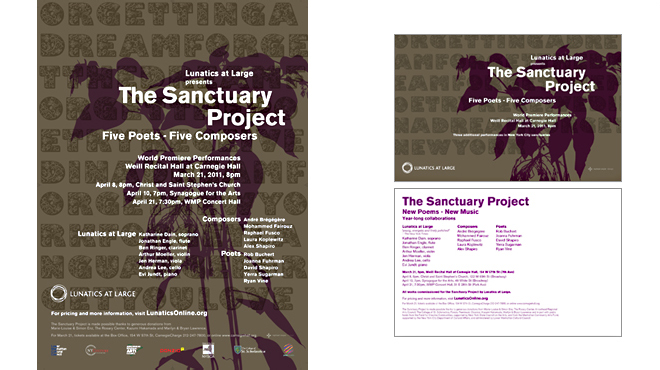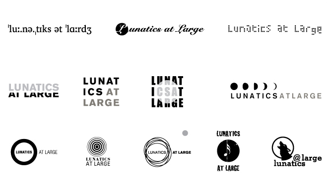 Logo/wordmark for large mixed ensemble lunatics at large – plus visual, posters and postcards for their Sanctuary Project (with world premieres at Carnegy Hall, New York): composers and poets have been commissioned by lunatics at large to write works on the theme Sanctuary.